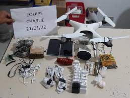 Foram encontrados um drone, dois aparelhos celulares, 13 conectores para carregador, nove cabos USB e quatro fones de ouvidos Em ação rápida na noite...
