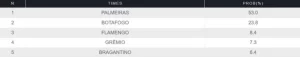 Por outro lado, as chances do Botafogo desceram mais ainda, agora de 28% para 23,8%. O RB Bragantino também viu sua porcentagem cair, mas de 15,9% para 6,4%.