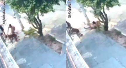 Pelas imagens é possível ver quando a criança e seus avós estão na calçada, momento em que o Pitbull chega correndo e avança sobre os moradores.