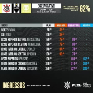 O Corinthians divulgou informações sobre a abertura da venda de ingressos para o duelo diante do Atlético-MG, na próxima quinta-feira, às 19 horas (de Brasília), pela 32ª rodada do Campeonato Brasileiro, na Neo Química Arena. A comercialização das entradas terá início já na manhã desta sexta-feira e será escalonada, levando em consideração as prioridades do Fiel Torcedor.