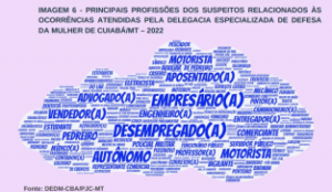 Conforme gráfico modelo nuvem de palavras, profissões em maior destaque que praticam violência são: empresário, advogado, vendedor, autônomo, motorista, comerciante, entregador, pedreiro e desempregado.