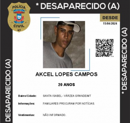 A Polícia Civil já divulgou que Akcel, morador do bairro Santa Isabel em Várzea Grande, está desaparecido desde o dia 15 de abril e que sua família busca por notícias. Um mandado de prisão no nome dele está em aberto.