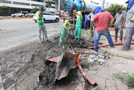 A imagem mostra uma equipe de trabalhadores realizando a limpeza em uma boca de lobo na Avenida do CPA, com a ajuda de um caminhão sugador. Eles estão em um buraco aberto na calçada. Os trabalhadores estão usando uniformes e acessórios de proteção, como bonés e luvas, e a área ao redor está sendo isolada com cones.